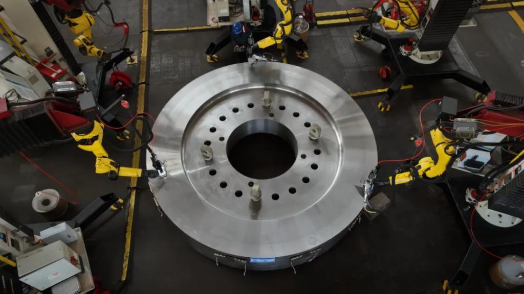 在转轮的工艺制造上,采用机器人电弧增材制造(3D打印)技术,“打印”完成后,大圆环就会“长”出一片片水斗型“花瓣”,这道程序就是所谓的“铁臂绣花”。“铁臂绣花”不仅降低了锻件制造难度,提高了材料利用率,还可以让转轮应对极端情况。